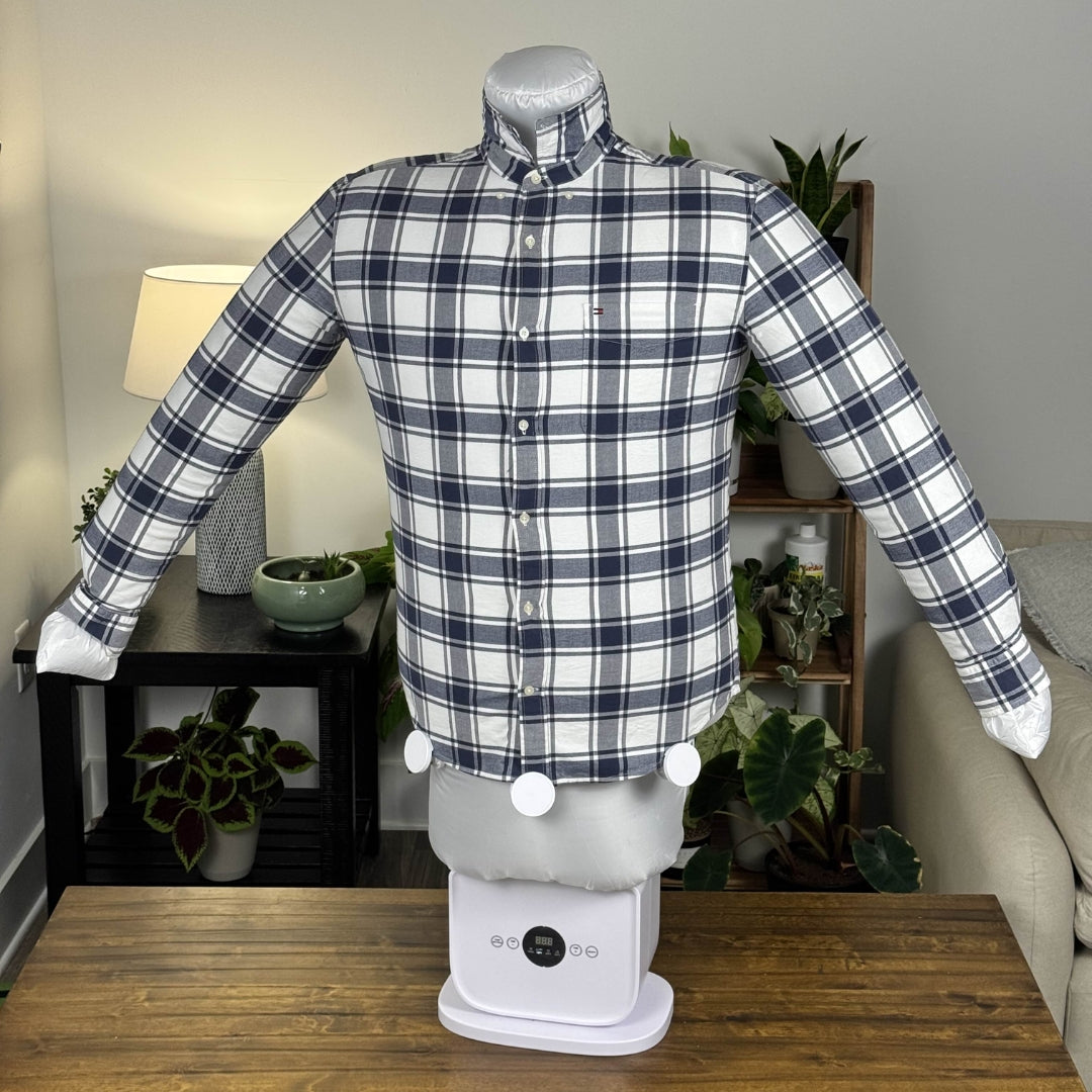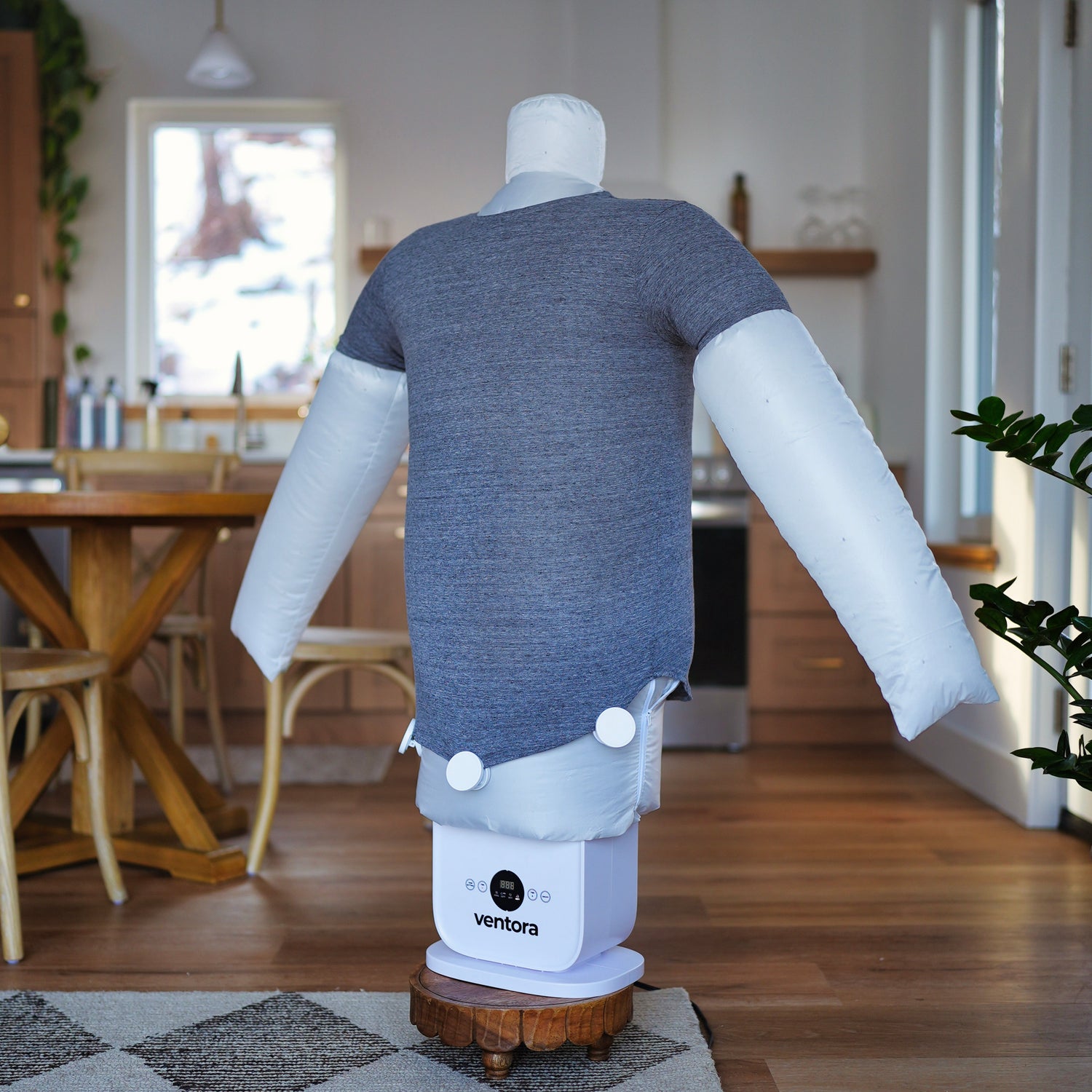 Ventora bläst sich sanft mit warmer Luft auf, um den Stoff zu entspannen und zu glätten. Ziehe ein feuchtes Hemd oder eine Hose über die Form, befestige es mit Clips und stelle Zeit und Temperatur ein. Während sich das Gerät füllt, trocknet die warme Luft den Stoff und hinterlässt deine Kleidung knitterfrei und sofort tragbar.